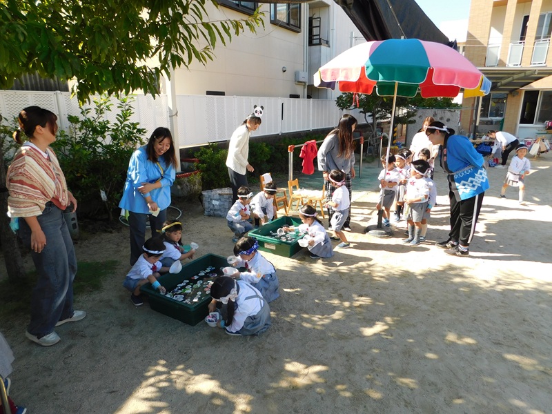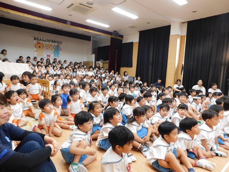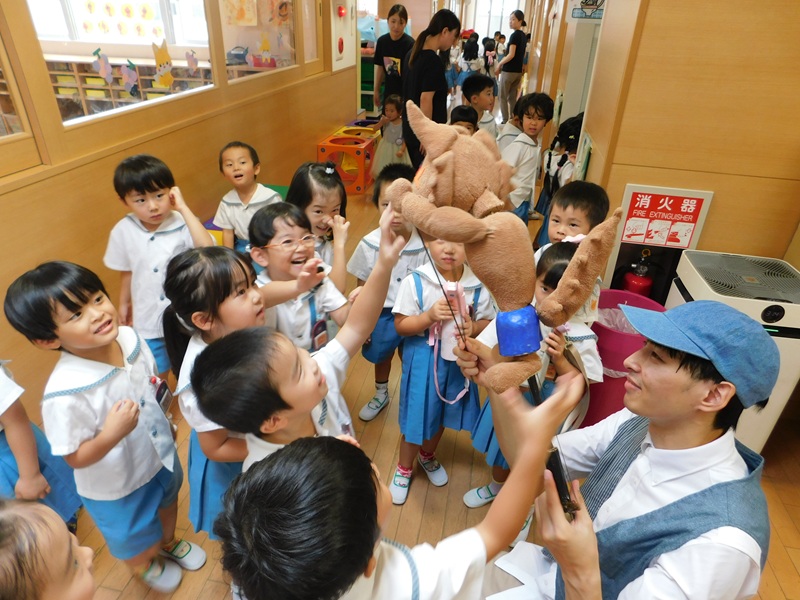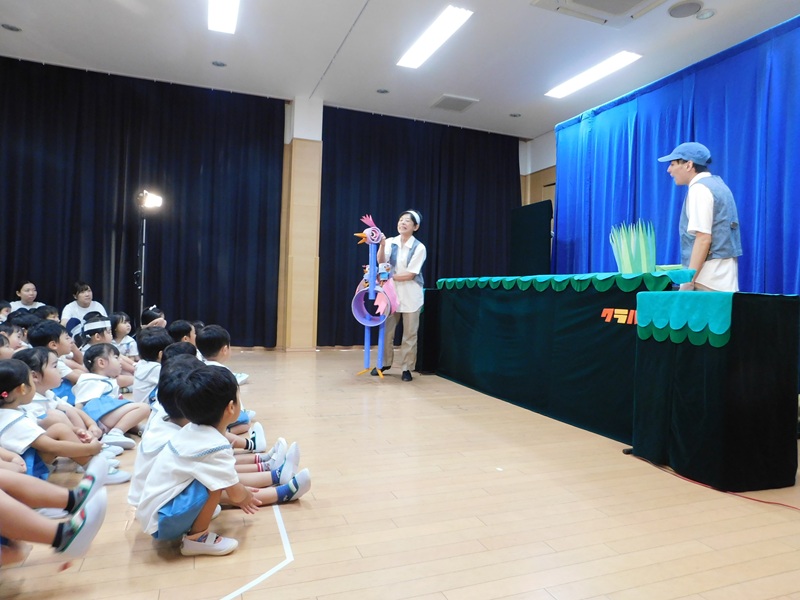 | 今日は、人形劇団クラルテさんによる人形劇を、全園児一緒に鑑賞しました。 お話に引き込まれた子ども達の表情を見ていると、表情をころころと変え、お話の世界に浸っている様子が分かりました。 終演後、登場したお人形がでてきてくれると、子ども達はお人形との会話を楽しんでいました。 友達や先生と一緒に鑑賞し、楽しさを共有することができ、よい体験となりました。 ありがとうございました。 |